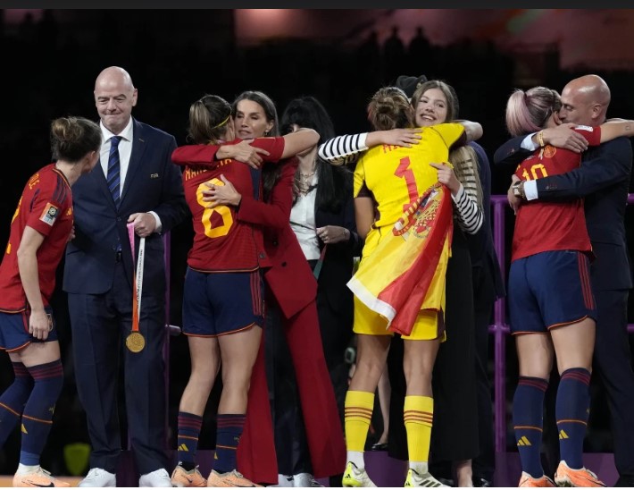 Rubiales besó en los labios a la jugadora española Jenni Hermoso durante la entrega de medallas y trofeos en el campo. También abrazó a varios otros jugadores y puso su brazo alrededor de la reina Letizia de España.