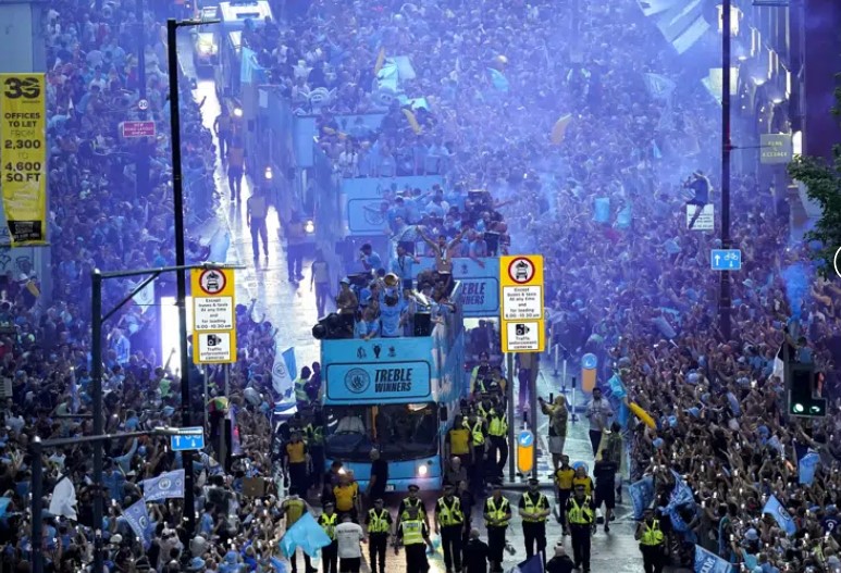 MANCHESTER (AP) — La champaña y la lluvia no dejaron de caer durante la celebración del lunes de los jugadores del Manchester City tras conseguir la tripleta de trofeos, quienes recorrieron el centro de la ciudad en un autobús descapotable frente a miles de aficionados.