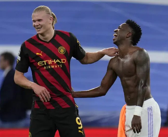 MADRID (AP) — Vinícius Júnior y Erling Haaland lucían relajados y sonrientes justo después del silbatazo final, cuando se abrazaron en el Estadio Santiago Bernabéu.El atacante brasileño del Real Madrid y el delantero noruego del Manchester City parecían satisfechos después de un empate 1-1 en la ida de las semifinales de la Liga de Campeones, que quedaron para cualquiera de cara a la revancha de la próxima semana en Inglaterra.