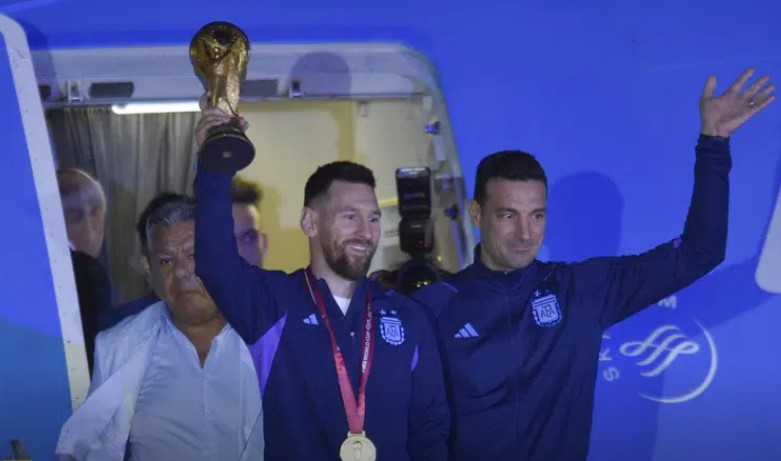 Messi fue el primer jugador en salir del avión con el trofeo del Mundial poco antes de las 3 de la madrugada, acompañado del técnico Lionel Scaloni, que rodeó al capitán con el brazo mientras pasaban junto a un cartel con el mensaje “Gracias, campeones”.