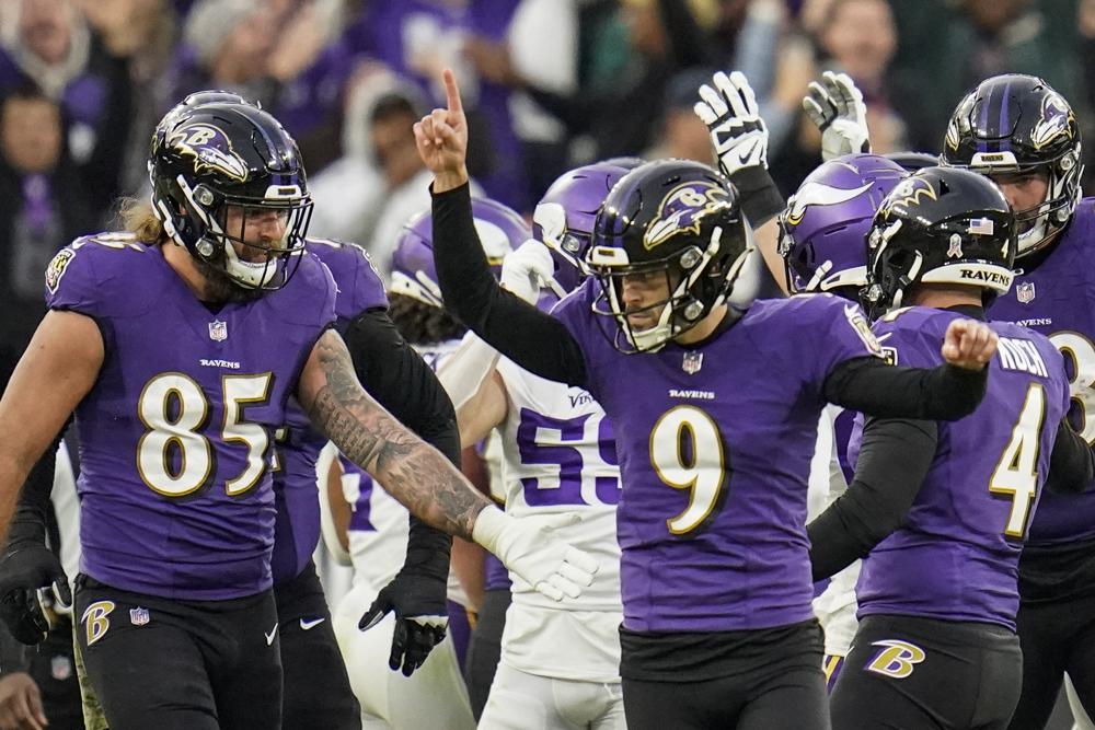 BALTIMORE, Maryland, EE.UU. (AP) — Justin Tucker conectó un gol de campo de 36 yardas con 16 segundos por jugar en el tiempo extra para darles a los Ravens de Baltimore una victoria el domingo 34-31 sobre los Vikings de Minnesota.Los Ravens (6-2), líderes de la División Norte de la AFC, borraron una desventaja de 14 puntos en el tercer cuarto y sobrevivieron a una acrobática intercepción de Anthony Barr en la primera serie ofensiva del tiempo extra. Barr desvió un pase de Lamar Jackson que él mismo atrapó, para darle el balón a los Vikings en su propia yarda 38, pero Minnesota no pudo convertir un primero y diez, y Baltimore volvió a colocar el ovoide a distancia para Tucker.