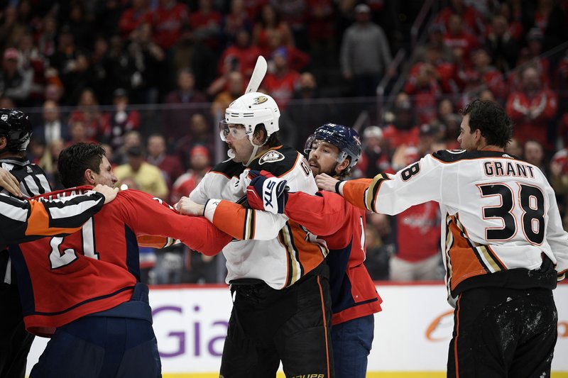 Después de algunas hostilidades intermitentes en los primeros 39 minutos, Brendan Leipsic de Washington incitó a la pelea derribando a Derek Grant de Anaheim justo antes de que Chandler Stephenson anotara para poner 3-0 Capitales con 33.4 segundos restantes en el segundo. Casi los 10 patinadores en el hielo se involucraron, y Hathaway luchó contra Gudbranson, Grant y Ritchie en cuestión de minutos.