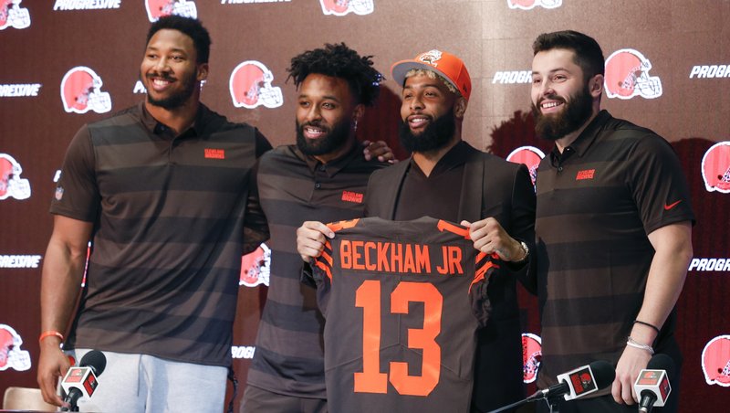 BEREA, Ohio, EE.UU. (AP) — Odell Beckham Jr. vio al quarterback Baker Mayfield sentado a su izquierda, Jarvis Landry a su derecha y Myles Garrett al final del estrado.