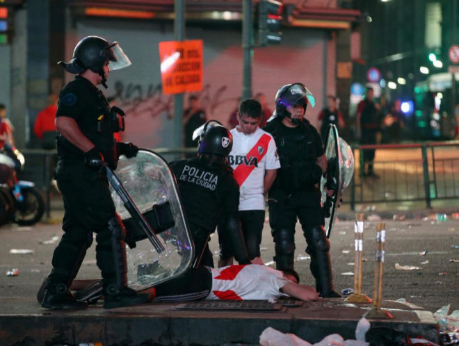 Algunos hinchas de River iniciaron una batalla campal contra todo, y comenzaron a lanzar piedras y botellas a los agentes y a los negocios que seguían abiertos.