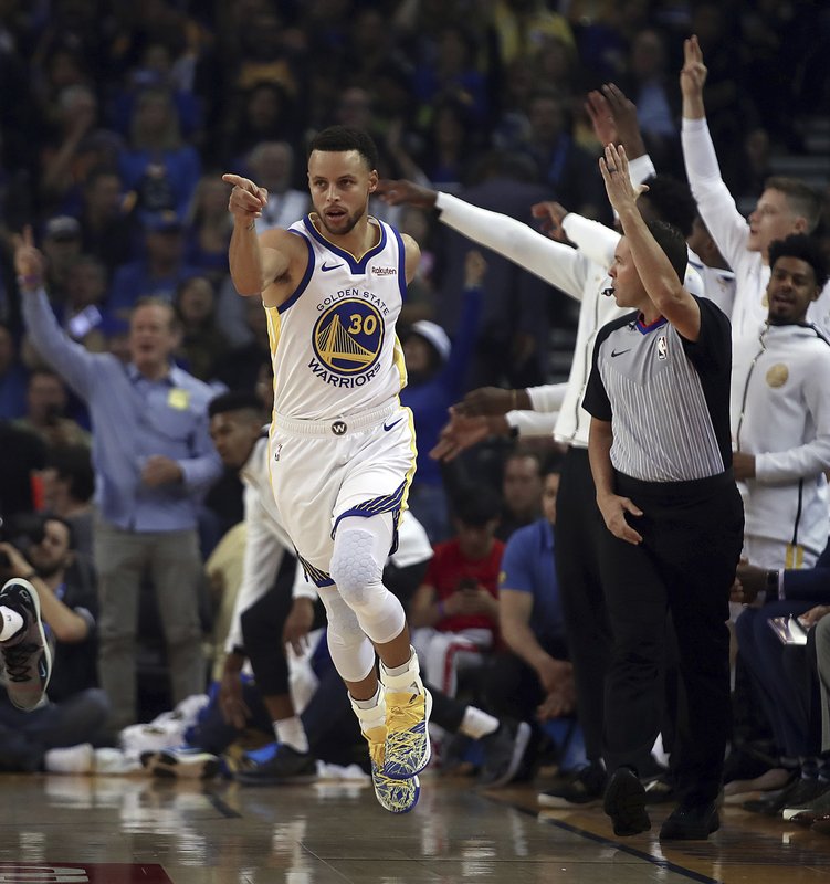 OAKLAND, California, EE.UU. (AP) — Stephen Curry anotó 32 puntos, repartió nueve asistencias y atrapó ocho rebotes, Kevin Durant terminó con 27 tantos, ocho rebotes y seis asistencias, y los Warriors de Golden State iniciaron el martes su camino hacia su tercer título consecutivo con una victoria por 108-100 sobre el Thunder de Oklahoma City.Golden State necesitó un último cuarto potente para ganar en una noche festiva. Los vigentes campeones recibieron sus anillos antes del saque inicial que abrió la que será su última temporada en el Oracle Arena. El equipo jugará el próximo año en el nuevo Chase Center, al otro lado de la Bahía de San Francisco.