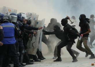 Los periodistas de AP vieron al menos a otros tres periodistas atacados por la policía y manifestantes, y a un oficial de policía acorralado y atacado por los manifestantes.