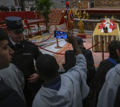 CIUDAD DEL VATICANO (AP) — El cuerpo del papa emérito Benedicto XVI, con la cabeza descansando sobre un par de almohadas rojas, yacía en la Basílica de San Pedro el lunes mientras miles personas hacían una larga fila para despedir al pontífice que sacudió al mundo con su decisión de retirarse hace una década.
