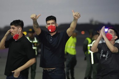 Fotos y videos publicados por el gobierno de El Salvador el viernes mostraron a venezolanos encadenados, sentados en una flota de autobuses y abordando aviones, rodeados de agentes antidisturbios. Un hombre levantó la vista y señaló al cielo mientras subía a un avión, mientras que otro hizo un gesto obsceno hacia la policía.