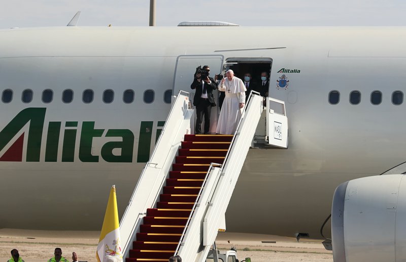 El avión de Francisco aterrizó en el aeropuerto de Bagdad poco antes de las 14:00 horas. Sobre la pista se desplegó una alfombra roja donde el primer ministro, Mustafa al-Kadhimi, esperaba para saludarlo. El papa cojeaba visiblemente en una señal de que su ciática, que le obligó a cancelar varios actos recientemente, podría estar molestándole.