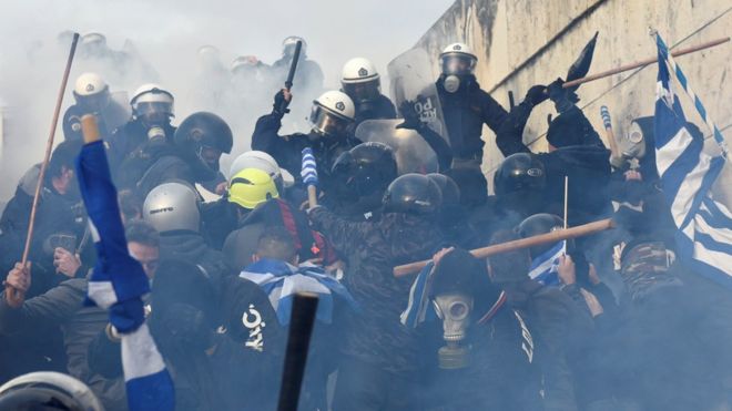 El cambio de nombre de un país vecino llevó a decenas de miles de griegos a concentrarse este domingo en Atenas, donde fueron dispersados por la policía con gases lacrimógenos.