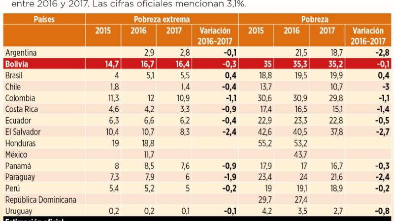 Bolivia es el país que menos redujo la pobreza en la región, apenas 0,1 puntos porcentuales entre 2016 y 2017, según estimaciones de la Comisión Económica para América Latina (CEPAL).