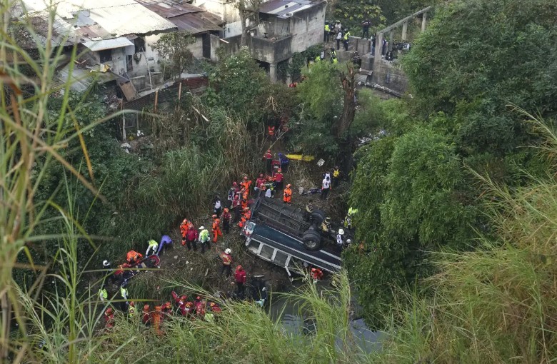 El portavoz de los bomberos, Edwin Villagran, dijo que un choque de varios vehículos hizo que el autobús se saliera de la carretera y cayera en un barranco empinado debajo del puente antes del amanecer. Otras personas resultaron gravemente heridas.