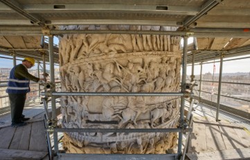 Un amplio andamio cuadrado a su alrededor ofrece a los restauradores el espacio necesario para trabajar cómodamente. Pueden retirarse y observar las figuras, que aumentan de tamaño gradualmente a lo largo de la columna, una técnica para hacerlas más visibles desde el suelo.