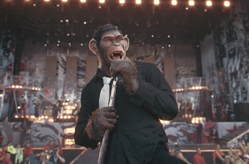 Buen punto. El concepto central de la película de Gracey, como ves, es que Williams está representado en todo momento por un mono, un mono generado por ordenador (el actor Jonno Davies proporciona los movimientos capturados y la voz hablada). Esta decisión nunca se explica ni siquiera se menciona.