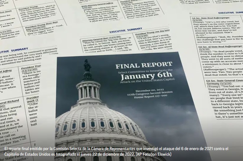 WASHINGTON (AP) — El informe final de la comisión del 6 de enero de la Cámara de Representantes afirma que Donald Trump participó criminalmente en una “conspiración multipartita” para anular los resultados legítimos de las elecciones presidenciales de 2020 y no actuó para impedir que sus partidarios atacaran el Capitolio, concluyendo así una extraordinaria investigación de 18 meses sobre el expresidente y la insurrección violenta de hace dos años.El informe de 814 páginas publicado el jueves se difundió después de que el panel entrevistara a más de 1.000 testigos, celebrara 10 audiencias y obtuviera millones de páginas de documentos. Los testigos —que van desde asesores cercanos a Trump hasta algunos de los propios insurrectos— detallaron las acciones de Trump en las semanas previas a la insurrección y cómo su campaña de presión para anular su derrota influyó directamente en quienes empujaron brutalmente a los agentes de policía y destrozaron las ventanas y puertas del Capitolio el 6 de enero de 2021.