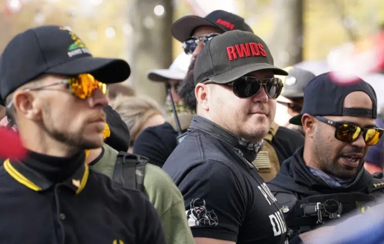 Fotografías publicadas en redes sociales parecían mostrar al expresidente nacional de los Proud Boys, Enrique Tarrio, y a otro exlíder de los Proud Boys, Jeremy Bertino, entre los que han llevado esos parches.