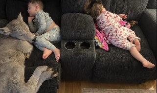 Pronto el ternero estaba acostado en el sofá, acurrucándose con sus pequeños hijos.