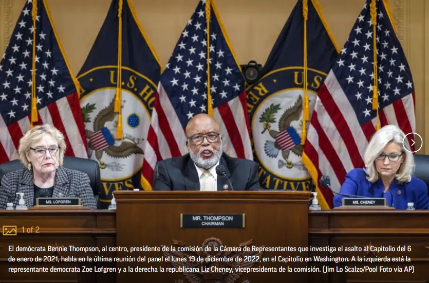 WASHINGTON (AP) — La comisión de la Cámara de Representantes encargada de investigar la violenta insurrección en el Capitolio de Estados Unidos el 6 de enero de 2021 instó el lunes al Departamento de Justicia a presentar cargos penales contra Donald Trump, pidiendo que el expresidente sea responsabilizado y haya “un momento de reflexión y ajuste de cuentas”.Al culminar una de las pesquisas del Congreso más exhaustivas y enérgicas que se recuerden, el panel conformado por siete demócratas y dos republicanos recomendó aplicar cargos penales contra Trump y aquellos que lo ayudaron a lanzar una campaña de presión de amplio alcance para tratar de anular su derrota en las elecciones de 2020. El panel también dio a conocer un extenso resumen de su informe final, con hallazgos de que Trump participó en una “conspiración múltiple” para obstaculizar la voluntad de los electores.
