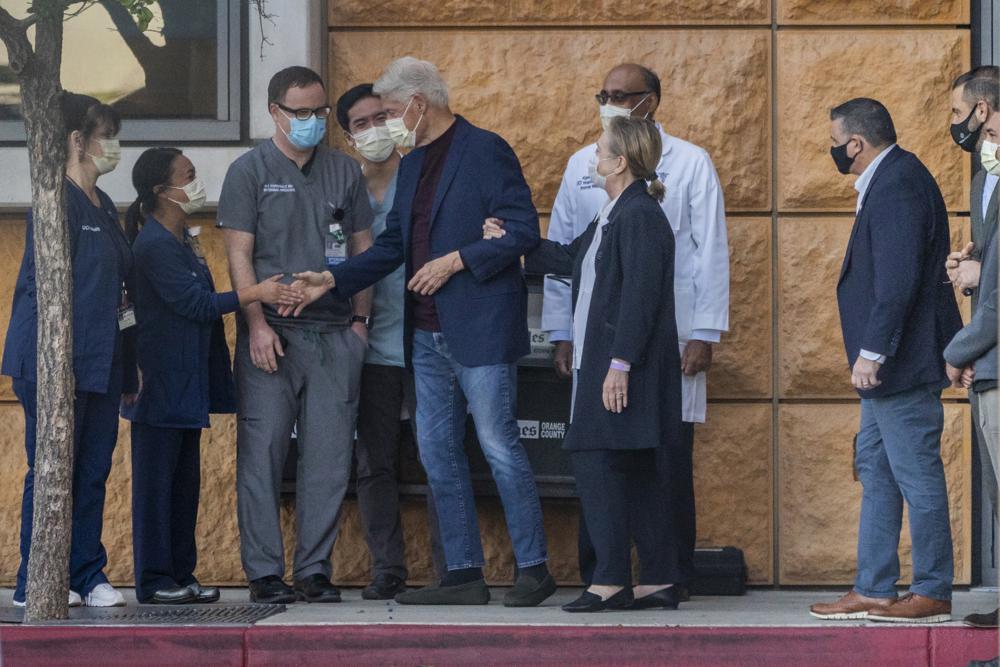 ORANGE, California, EE.UU. (AP) — El expresidente Bill Clinton llegó el domingo a su hogar en Nueva York para seguir recuperándose de una infección que lo mantuvo seis días en un hospital del sur de California, informaron autoridades.Clinton salió del Centro Médico Irvine de la Universidad de California a las 8 de la mañana con su esposa Hillary Clinton del brazo. Vestido con pantalones de mezclilla, saco deportivo y una mascarilla, salió del hospital lentamente y se detuvo para estrechar la mano de médicos y enfermeras alineados en la acera.