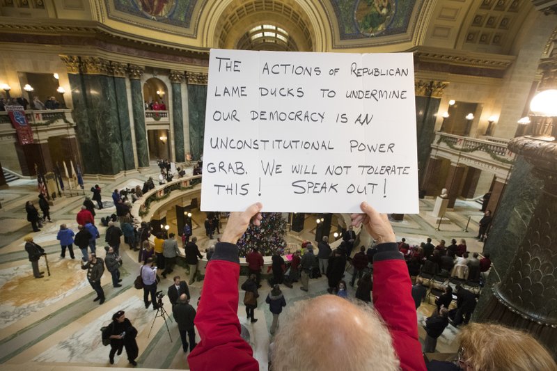 Los republicanos de Wisconsin impulsaron las protestas, el desacuerdo interno y la oposición demócrata para aprobar los proyectos de ley después de una sesión de toda la noche. Las medidas cambiarían el poder a la Legislatura controlada por los republicanos y debilitarían la autoridad del gobernador y el fiscal general. Los republicanos perdieron ambos escaños en las elecciones de noviembre.