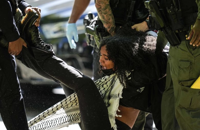 Muir dijo que la policía la levantó por los brazos y las piernas y se la llevó. Junto con otros estudiantes, Muir fue acusado el jueves de allanamiento de morada y alteración del orden público.