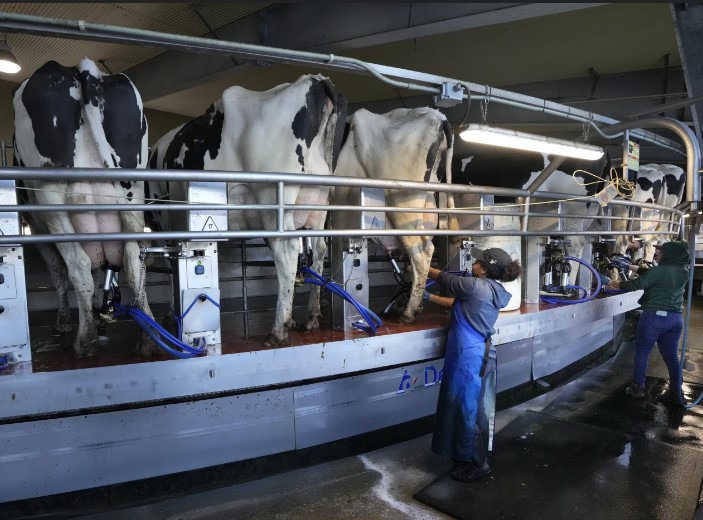 O consideremos la fuerza laboral de la granja Flood Brothers en Clinton, la “capital lechera” de Maine. Los trabajadores nacidos en el extranjero constituyen la mitad del personal de la granja, de casi 50 personas, que alimentan a las vacas, cuidan los cultivos y ayudan a recolectar la leche: 18.000 galones por día.