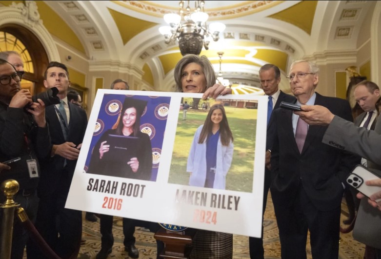 Mientras la representante Marjorie Taylor Greene, ataviada con prendas promocionales de Trump, seguía gritándole a Biden, el presidente sostuvo en alto un botón blanco que un republicano de Georgia le había entregado momentos antes y que llevaba el nombre de Laken Riley, quien, de acuerdo con las autoridades, fue asesinada por un migrante venezolano que ingresó sin autorización al país en septiembre de 2022.
