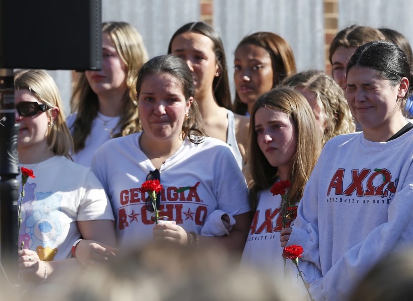 Cientos de estudiantes y profesores se reunieron el lunes por la tarde para una vigilia por Riley organizada por las hermanas de su hermandad en el campus de la Universidad de Georgia. Mucha gente lloró y los miembros de Alpha Chi Omega sostuvieron claveles, símbolo de la hermandad.